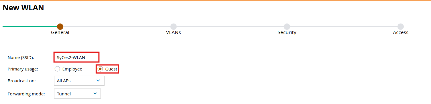 Im Reiter General: - Geben Sie einen aussagekräftigen Namen für das WLAN ein. - Legen Sie Primary Usage auf Guest fest. - Wählen Sie unter Broadcast on: den/die Access Point(s) aus, an dem/denen das WLAN verfügbar sein soll.