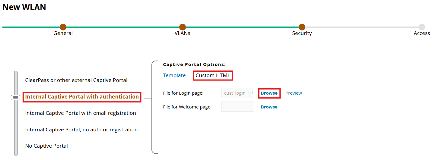 Im Reiter Security: 1. Wählen Sie Internal Captive Portal with authentication. 2. Wählen Sie Custom HTML als Anmeldeseitentyp. 3. Laden Sie Ihre HTML-Datei über die Schaltfläche Browse hoch.
