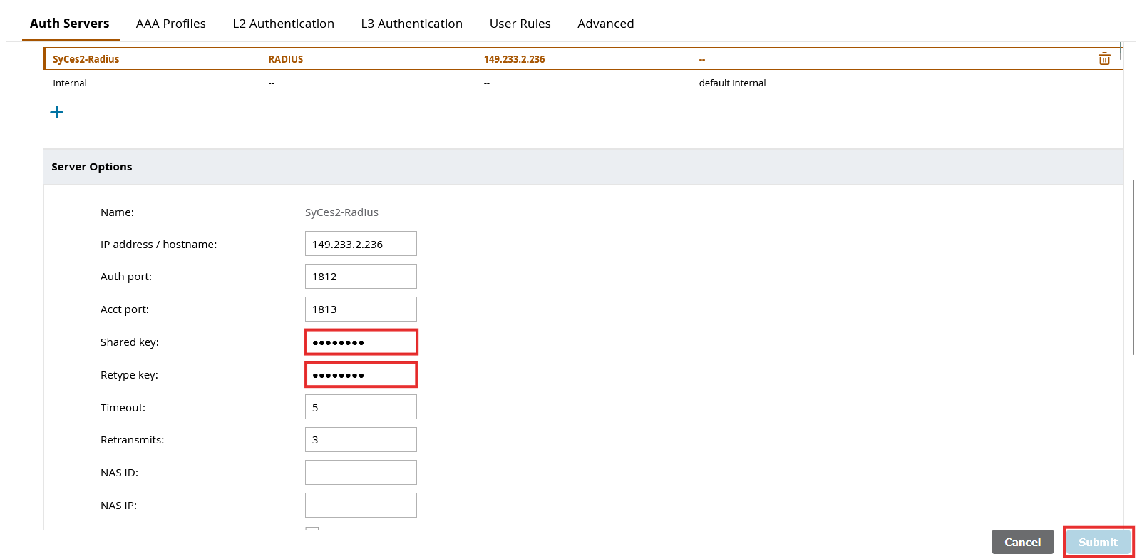 Für diese Konfiguration benötigen Sie die RADIUS-IP und das RADIUS-Secret. Beide finden Sie bei SyCes.