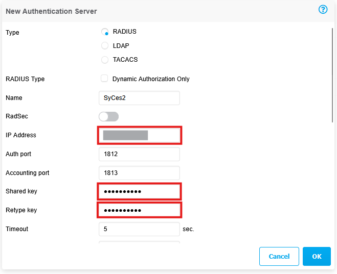 - Geben Sie unter IP Address die RADIUS-IP von SyCes🡕 ein.